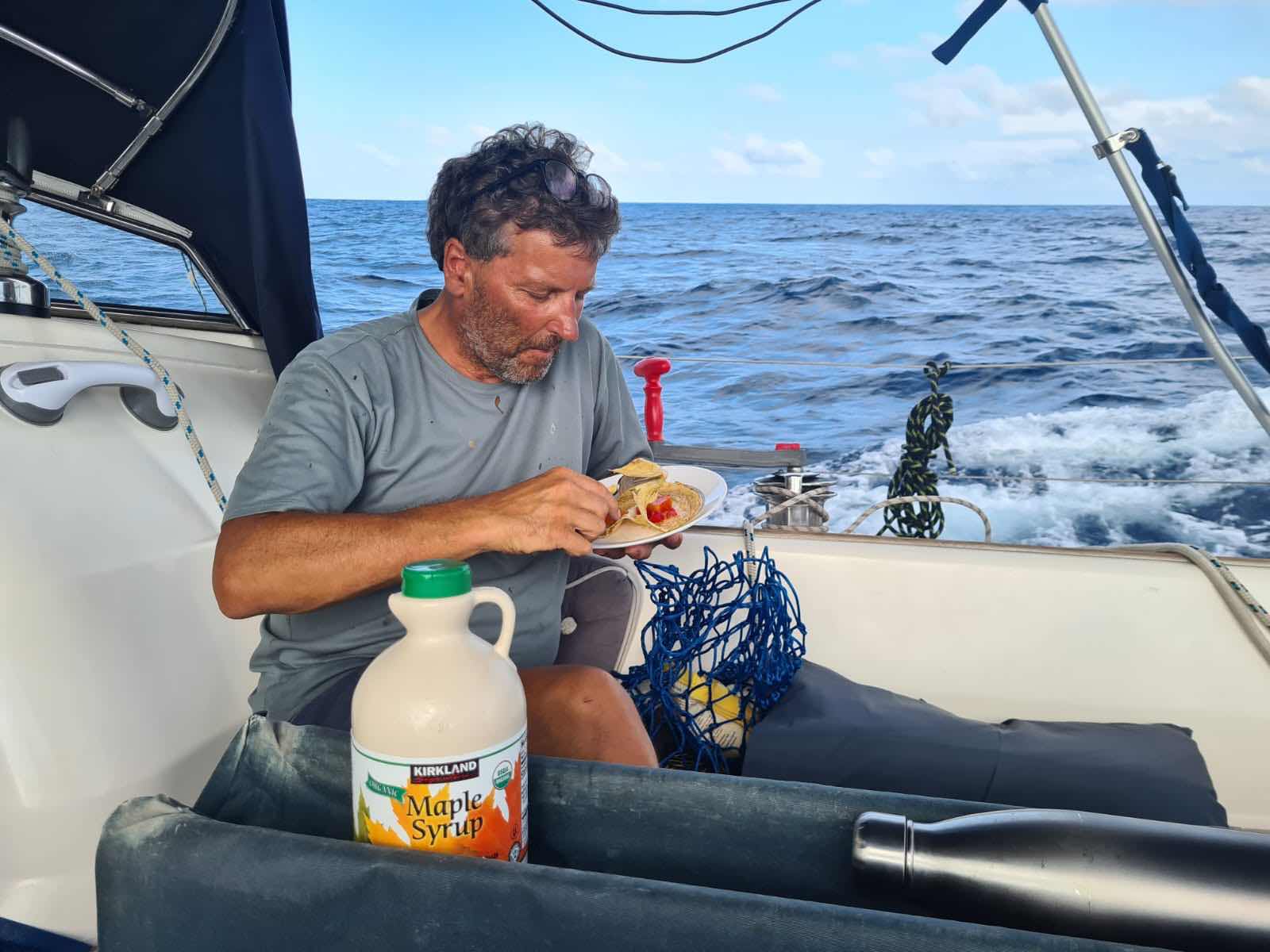 The dawn rose on a day full of celebration and excitement. Extreme pancake production was the first challenge of the day, undertaken professionally by Sally. These were lovingly prepared in the rolling seas to: