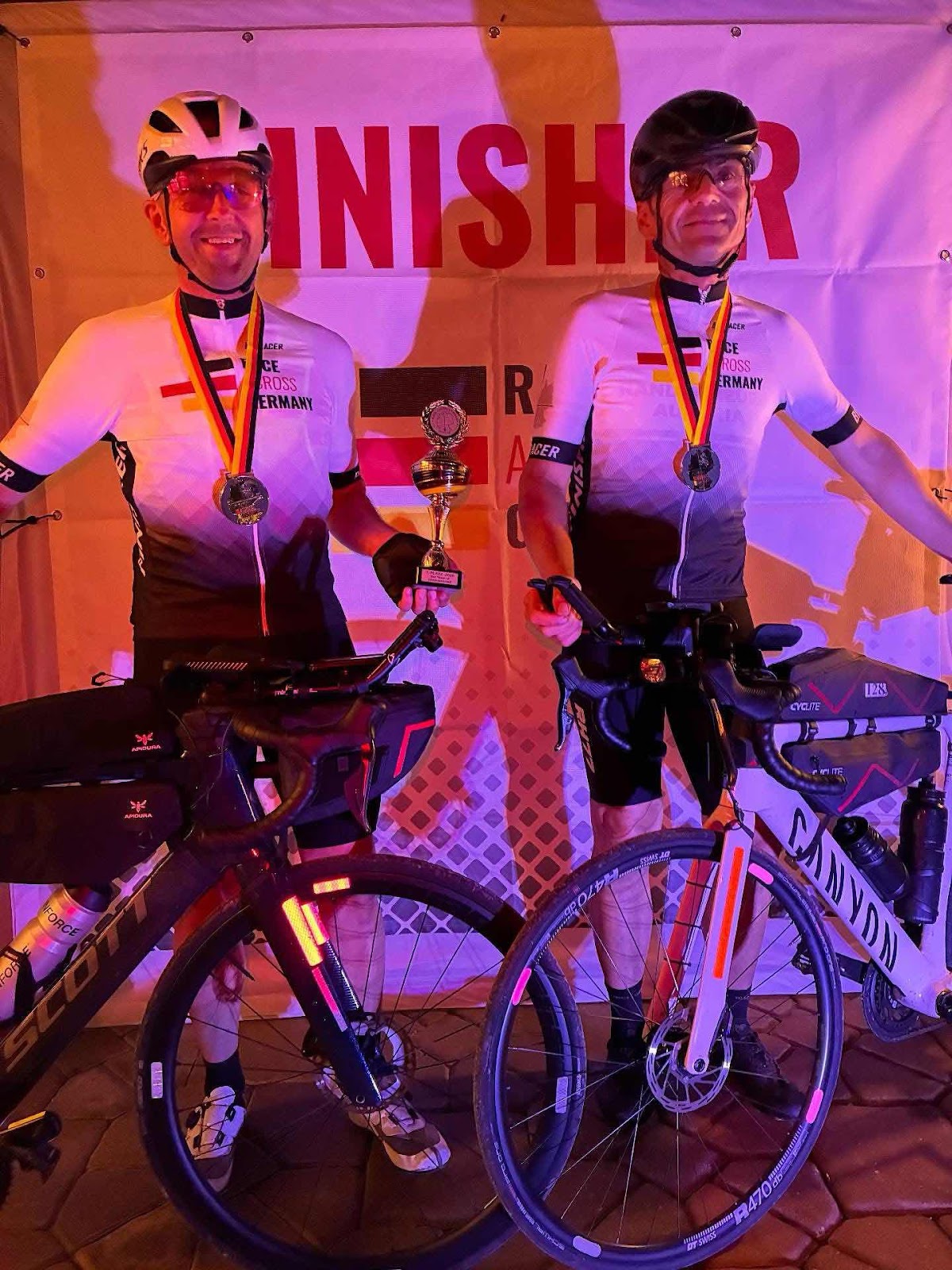 Sure enough Franz and his racing partner, Alex, raised the winner’s trophy in exactly the time Franz had predicted. Congratulations to them both. But sadly Berta’s entry was thwarted by a bike crash a couple of weeks ago when a moped pulled out in front of her leaving her in hospital with multiple broken ribs and a haemothorax. Luckily she escaped her hospital bed just in time to make it to the Garmisch finish line to welcome her extraordinary boyfriend