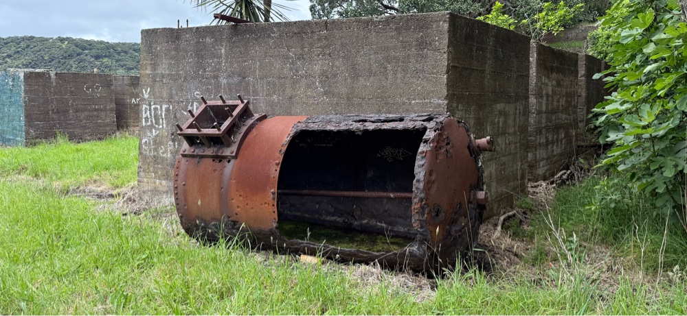 Whanga means harbour and 50 whales a year were despatchec and rendered a Whangamumu throughout much of the 20th century. The rusting relics remain.